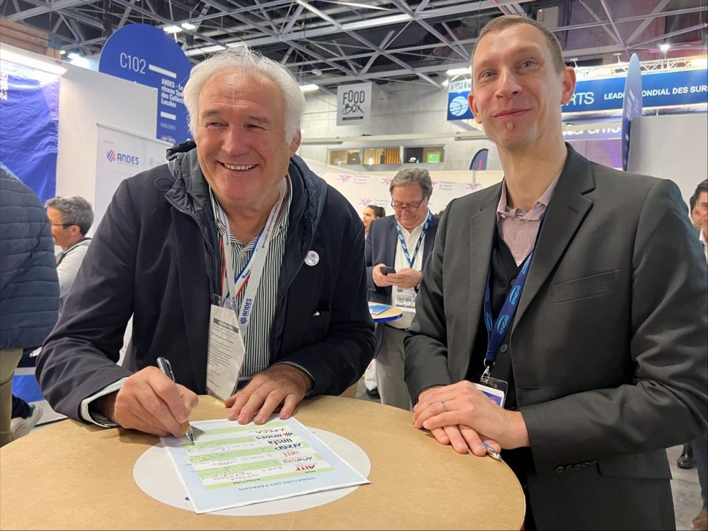 C’est à cette occasion que Romain Garnier, délégué général de Qualisport a pu faire signer notre Livre Blanc « Examens des capacités des candidats – Utilisation des certificats de qualification – Un instrument de confiance pour faciliter les choix des collectivités et des élus » par Patrick Appéré, président de l’ANDES (Association Nationale des Élus en charge du Sport) !