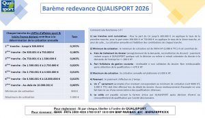 La redevance et les tarifs des prestations sont décidés par l’Assemblée Générale de l’association QUALISPORT (conformément à l’article 22 des statuts).